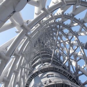 廣州塔由一座454米的塔身和156米的鋼結構桅桿組成,總高610米。塔身由鋼結構外框筒和鋼筋混凝土核心筒構成。內(nèi)外框筒通過樓層結構相連,但樓層缺失一半。焊接工作是廣州塔項目高難度工作之一,鋼結構外筒均采用鋼管構件,高空節(jié)點均為等強焊接連接。從保證焊接質量、提高焊接功效、減少焊